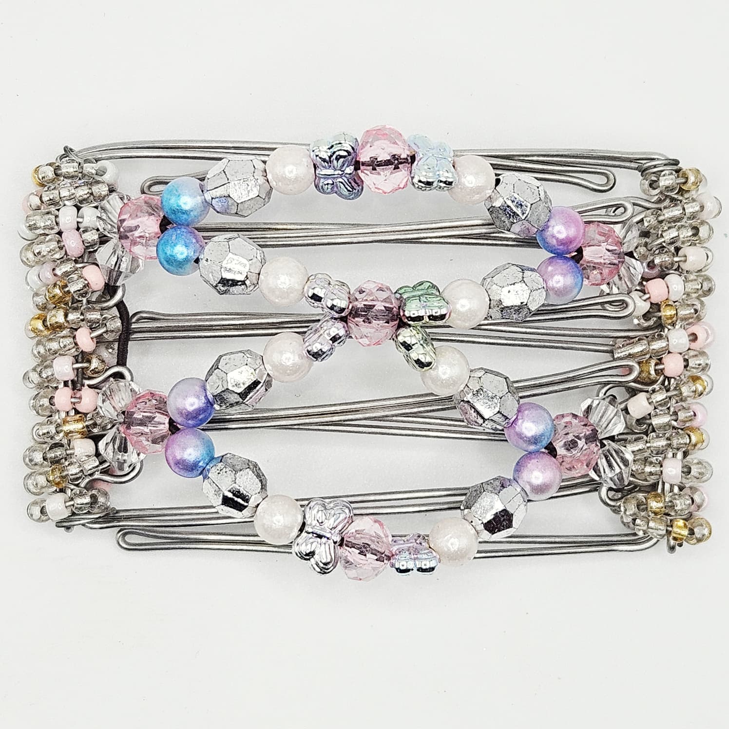 5 Tooth Small Hair comb, Silver butterfly design with blue, pink and white accents, Stainless steel frame with clear, white, pink and gold beaded wrapping