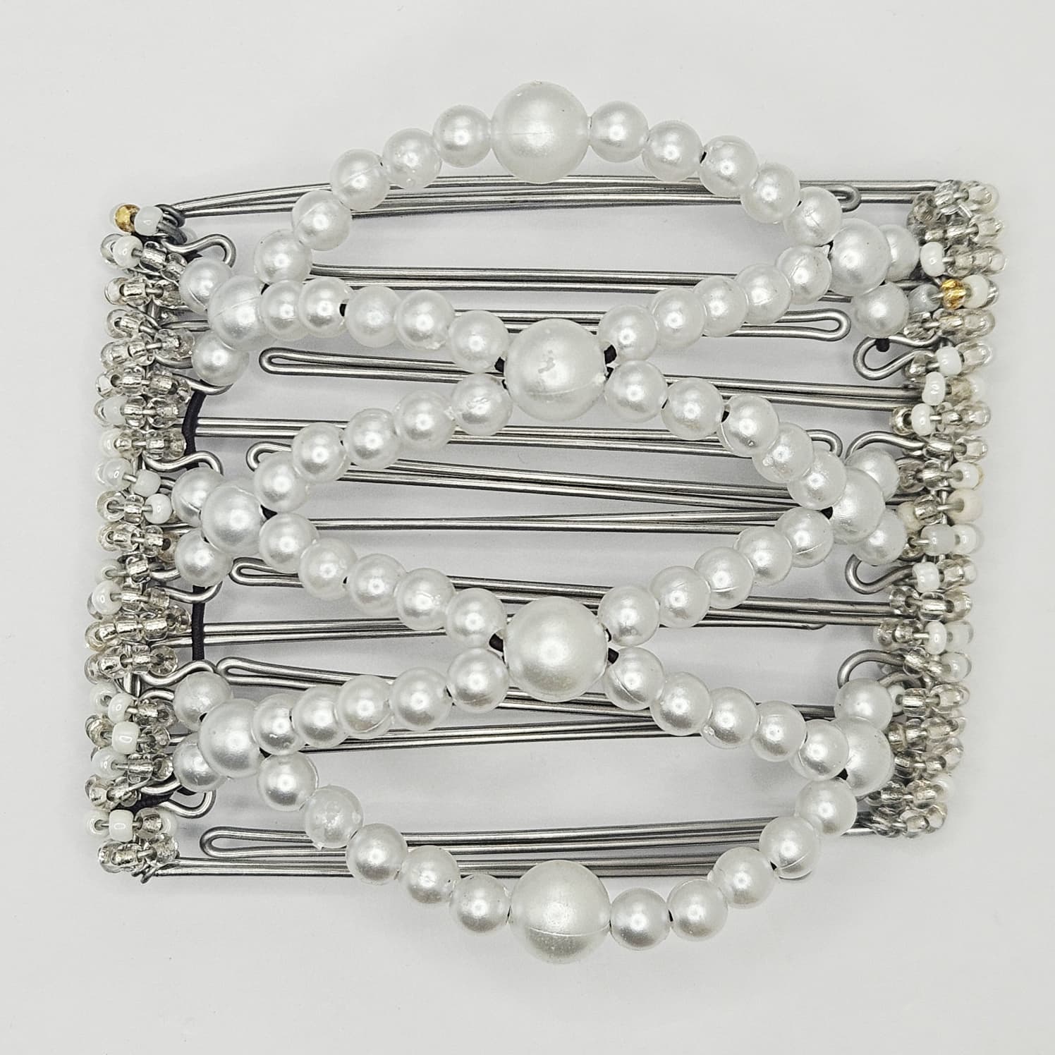 7 Tooth medium Hair comb, White plastic pearl beads, Stainless steel frame with white and clear crystal beaded wrapping.