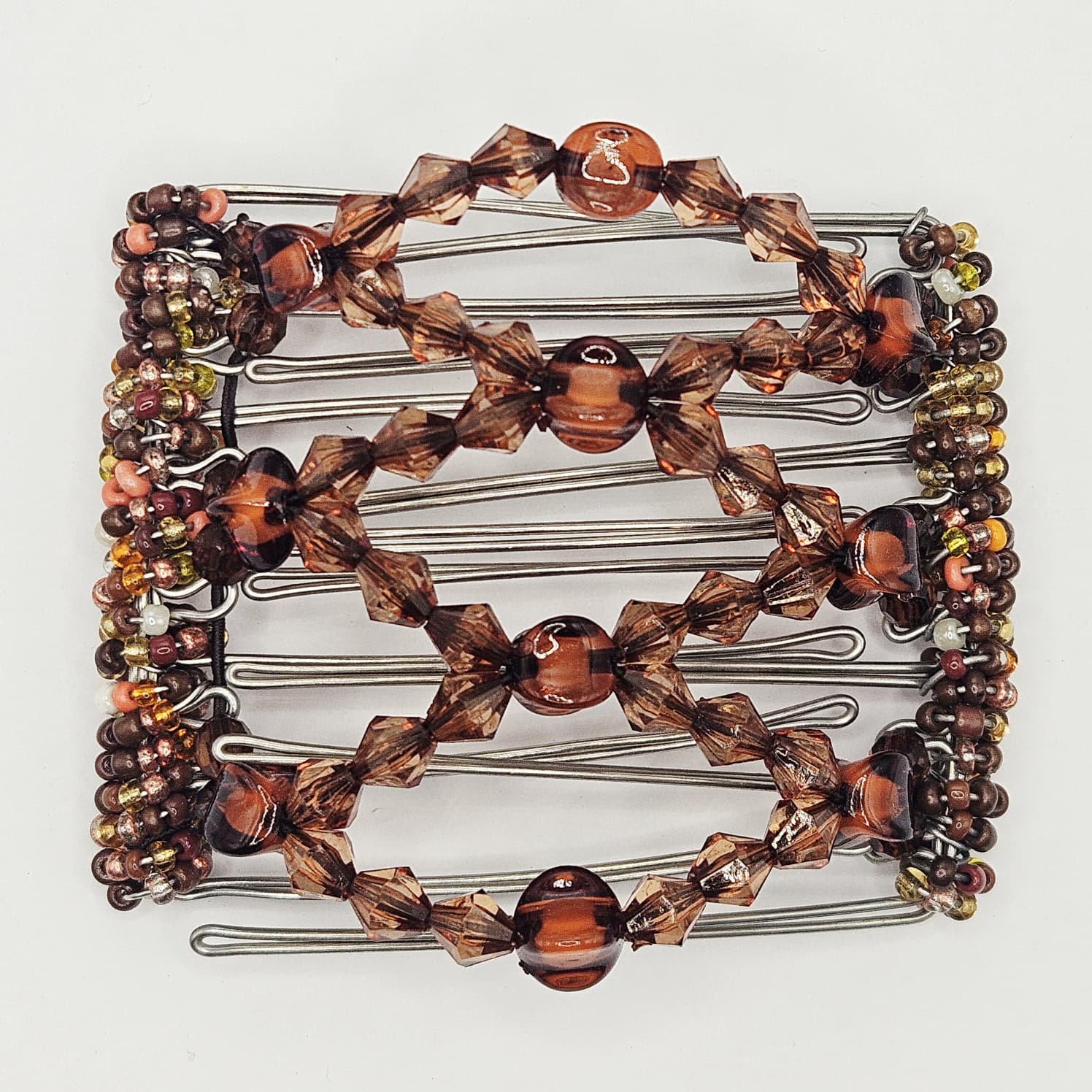 7 Tooth medium Hair comb, Amber sparkle design, All hair colors, 3D center and share bead, Stainless steel frame with brown, orange, white and brown beaded wrapping