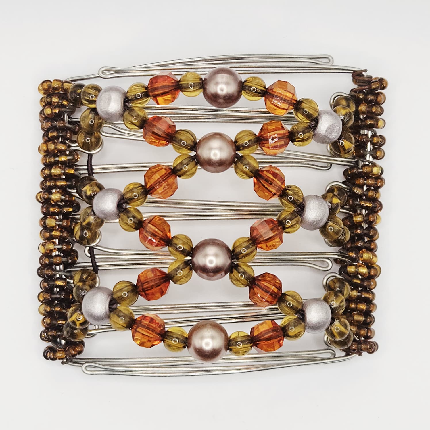 7-Tooth Medium hair comb, Amber, copper, and bronze tone neatrals, Stainless steel frame with amber beaded wrapping
