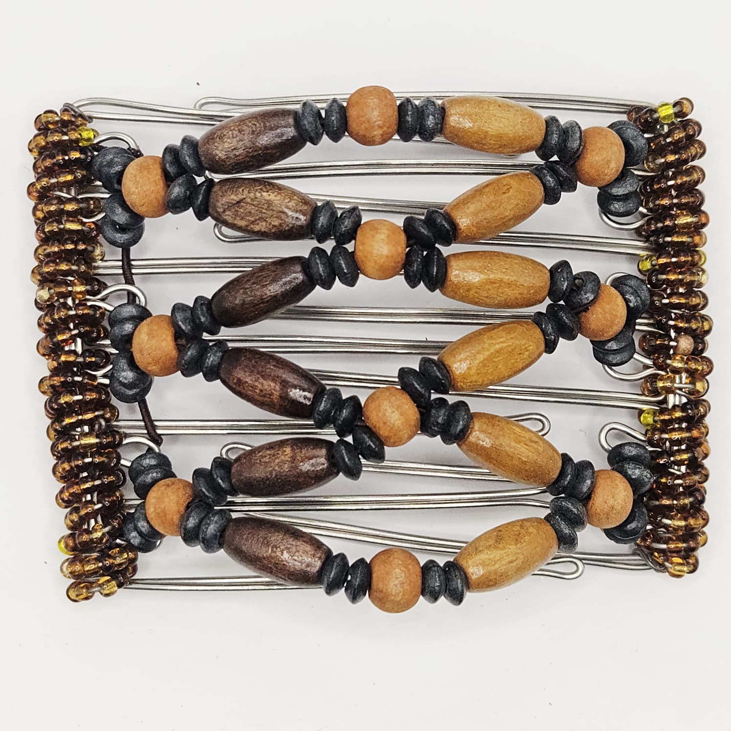7-Tooth Medium hair comb, Half black half brown design, neutral mix wooden beads, Stainless steel frame with amber beaded wrapping