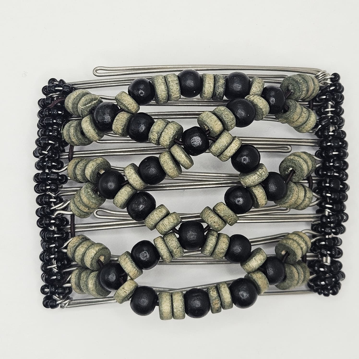 7 Tooth medium Hair comb, Wood medallions aged green color, black wooden accent beads, Stainless steel frame with black beaded wrapping.