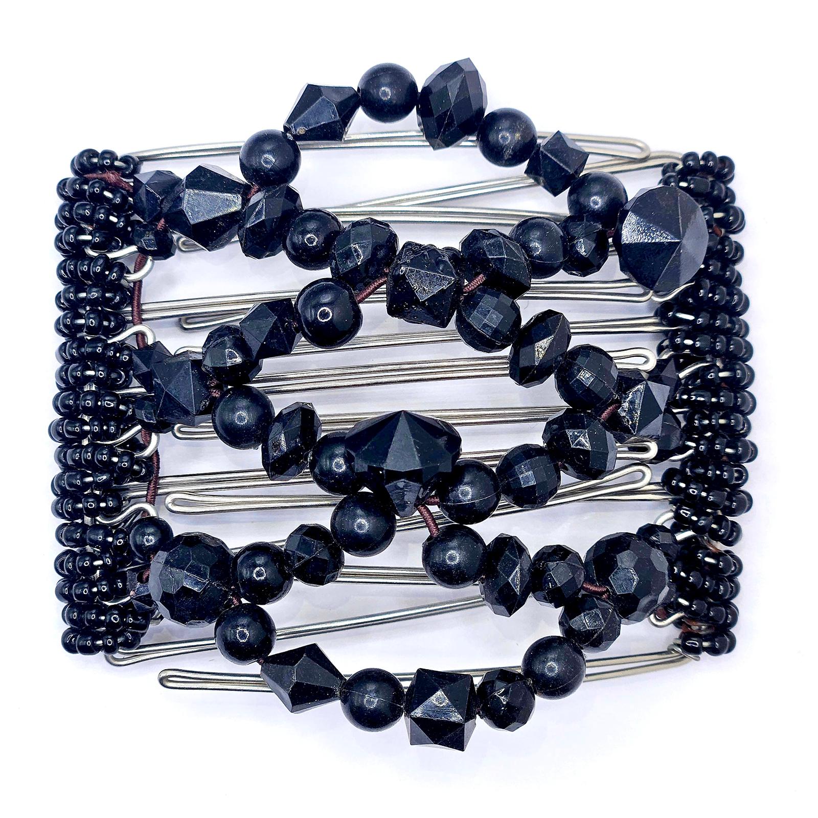 This piece features a uniform pattern in a random pattern of black sparkling acrylic beads. Materials include elastic and a stainless-steel frame. The frame is wrapped in a dressy black mix Czech glass beads for both grip and visual appeal.