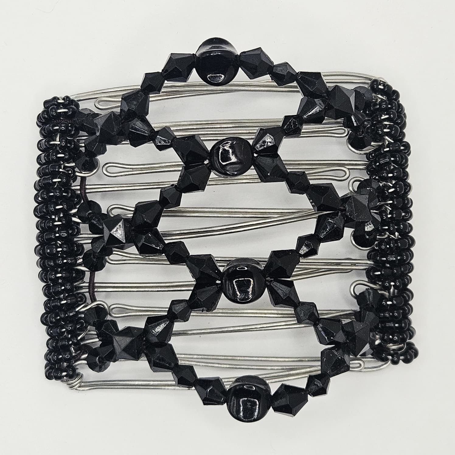7 Tooth medium Hair comb, Black acrylic sparkle beads, fluid black Onyx imitation centre Stainless steel frame with black beaded wrapping.