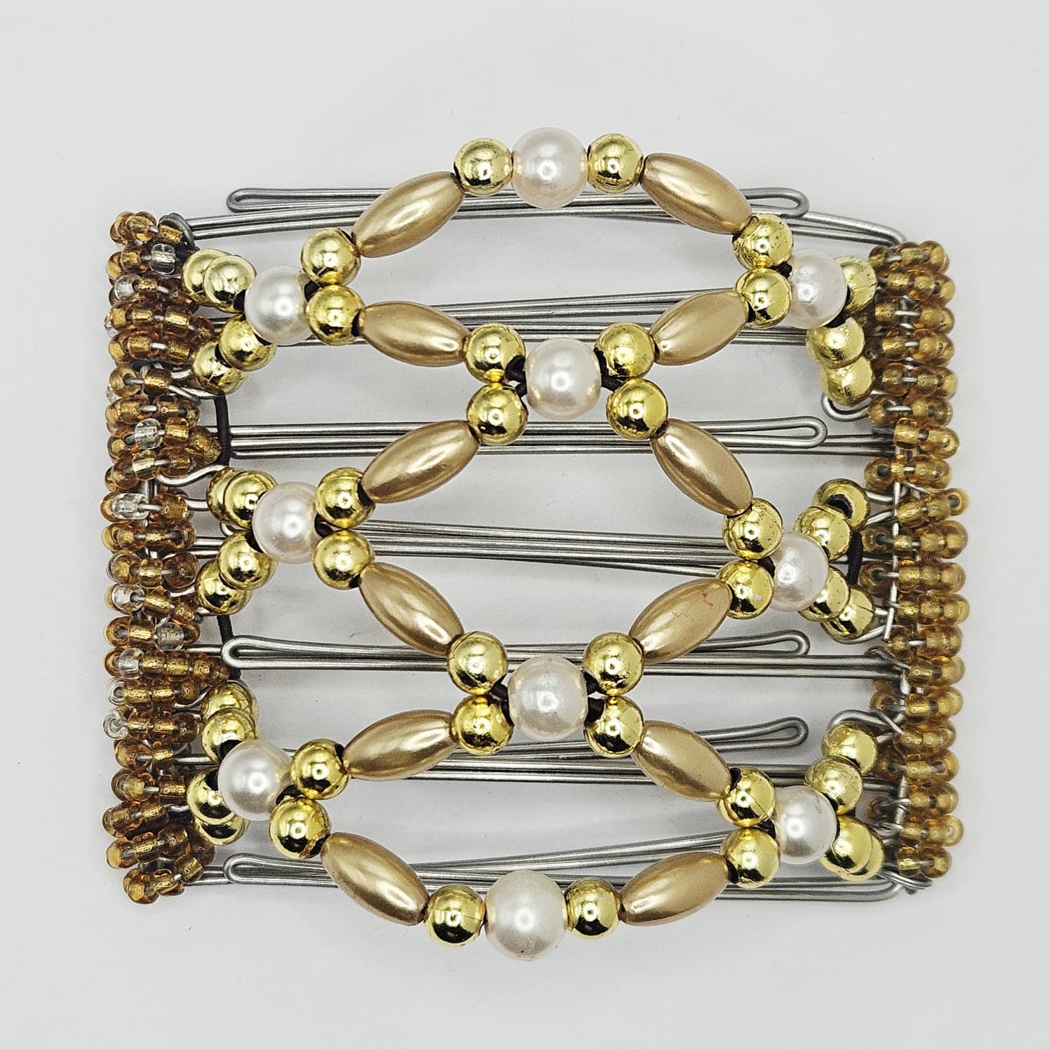 7 Tooth medium Hair comb, Geometric, elegant with cream colored share beads, golden oval centers bright gold side accents, stainless steel frame with gold beaded wrapping