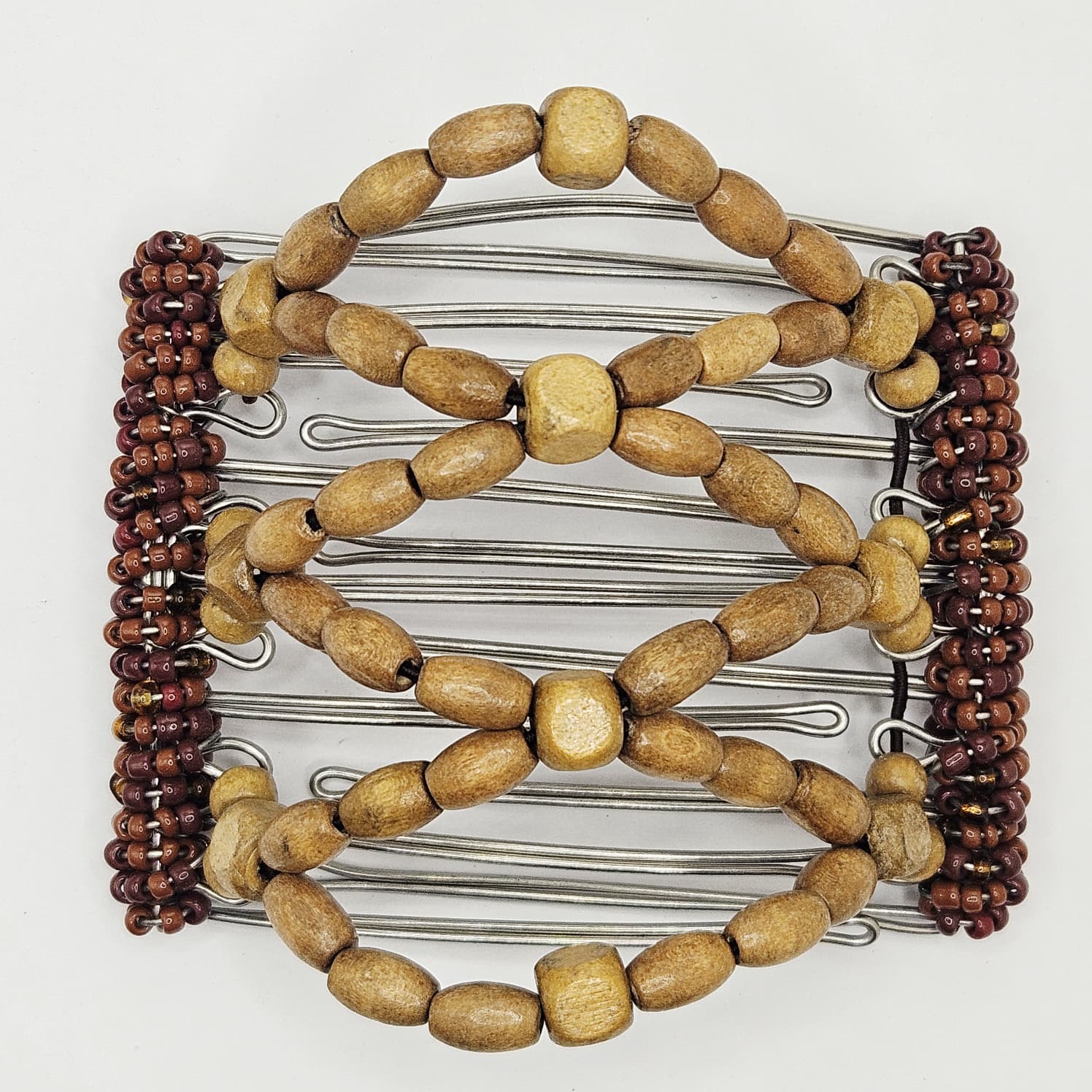 This unisex understated piece features a pattern of light brown/blonde wooden beads with warm undertones on a stainless-steel frame. The frame is wrapped in a neutral mix of brown Czech glass beads for grip and visual appeal.