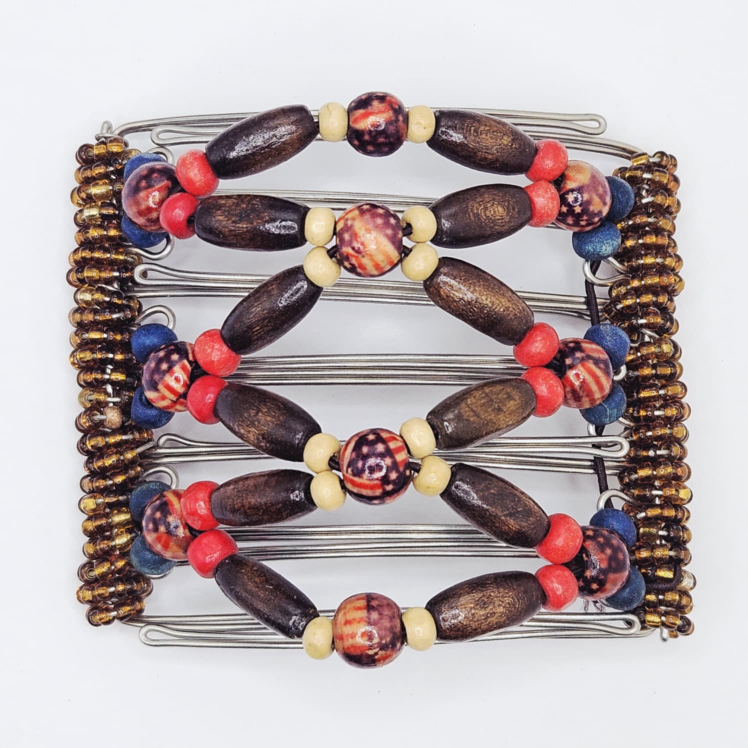 This piece features a uniform pattern of dark brown wooden beads with cream, blue and red accents. How cute are these subtle American flag beads? The frame is constructed of stainless-steel and wrapped in a mix of brown Czech glass beads for grip and visual appeal.