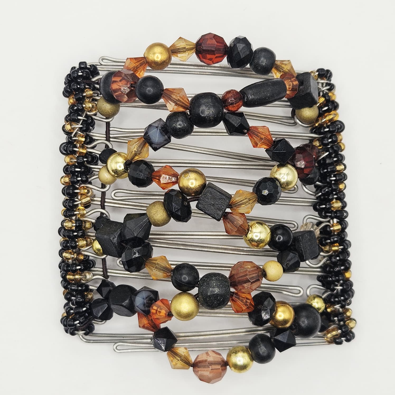 9 Tooth Large Hair comb,, Black, gold, and amber mix, neutral and elegant design, Top seller, Stainless steel frame with black and gold beaded wrapping