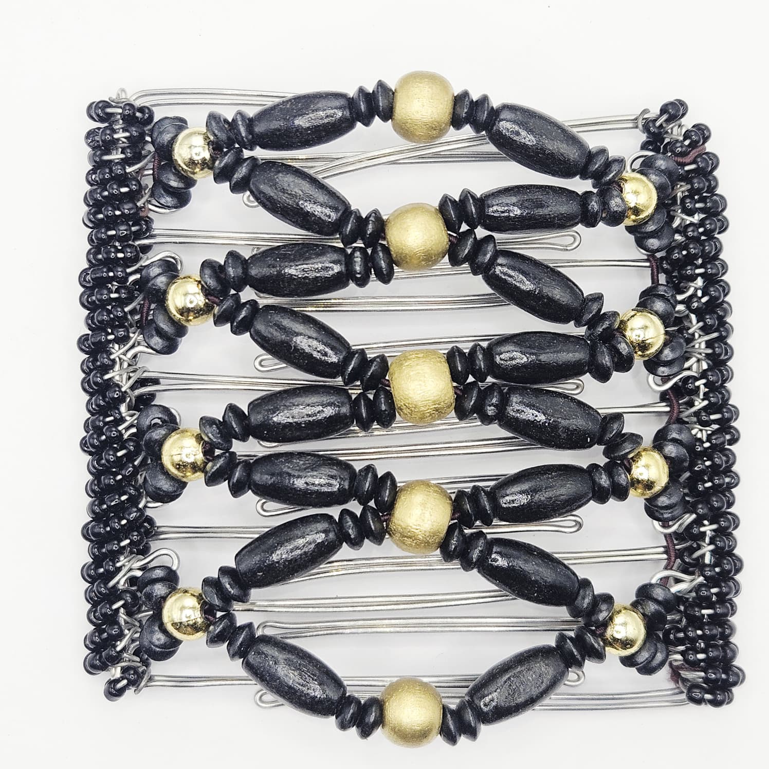 9 Tooth Large Hair comb, Black and gold tone wood beads with acrylic gold side share beads, Stainless steel frame with black beaded wrapping