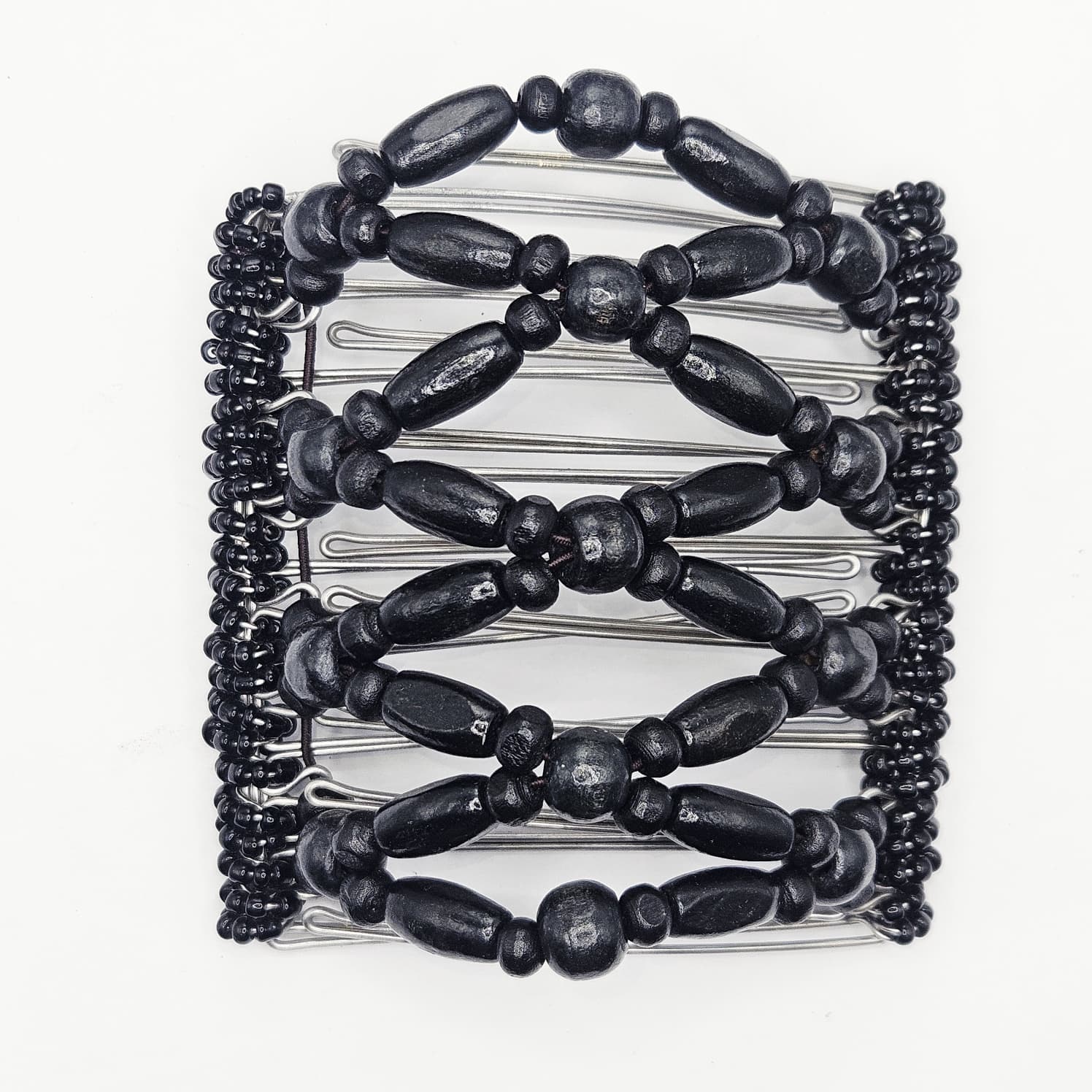 9 Tooth Large Hair comb, Black wood, neutral color, Stainless steel frame with black beaded wrapping