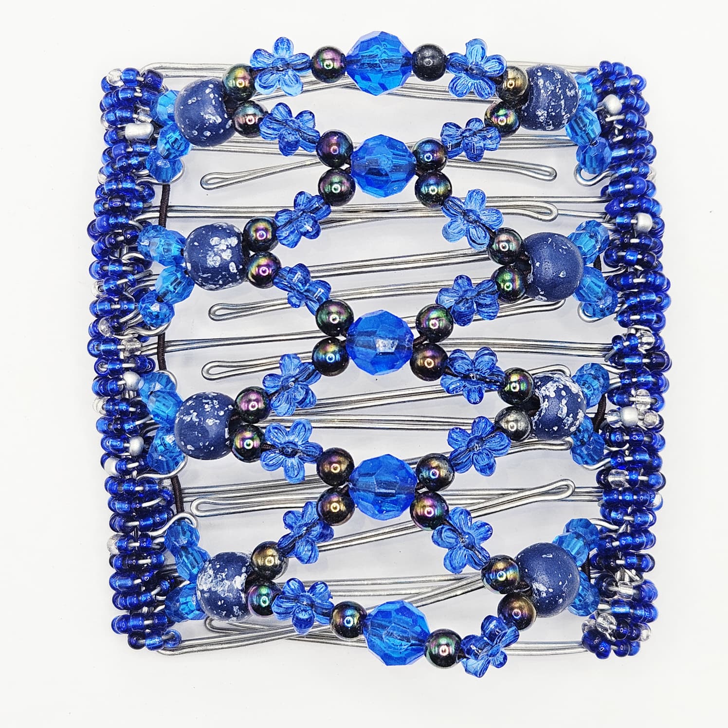 9 Tooth Large Hair comb, Blue mix acrylic and plastic blues with stone imitation side share beads, Stainless steel frame with blue beaded wrapping.