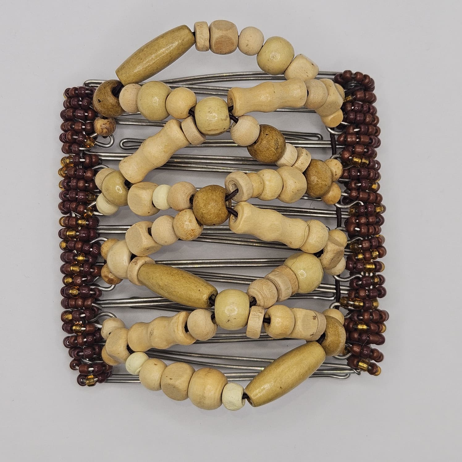 This unisex understated piece features a pattern of light brown/blonde wooden beads with warm undertones on a stainless-steel frame. The frame is wrapped in a neutral mix of brown Czech glass beads for grip and visual appeal.