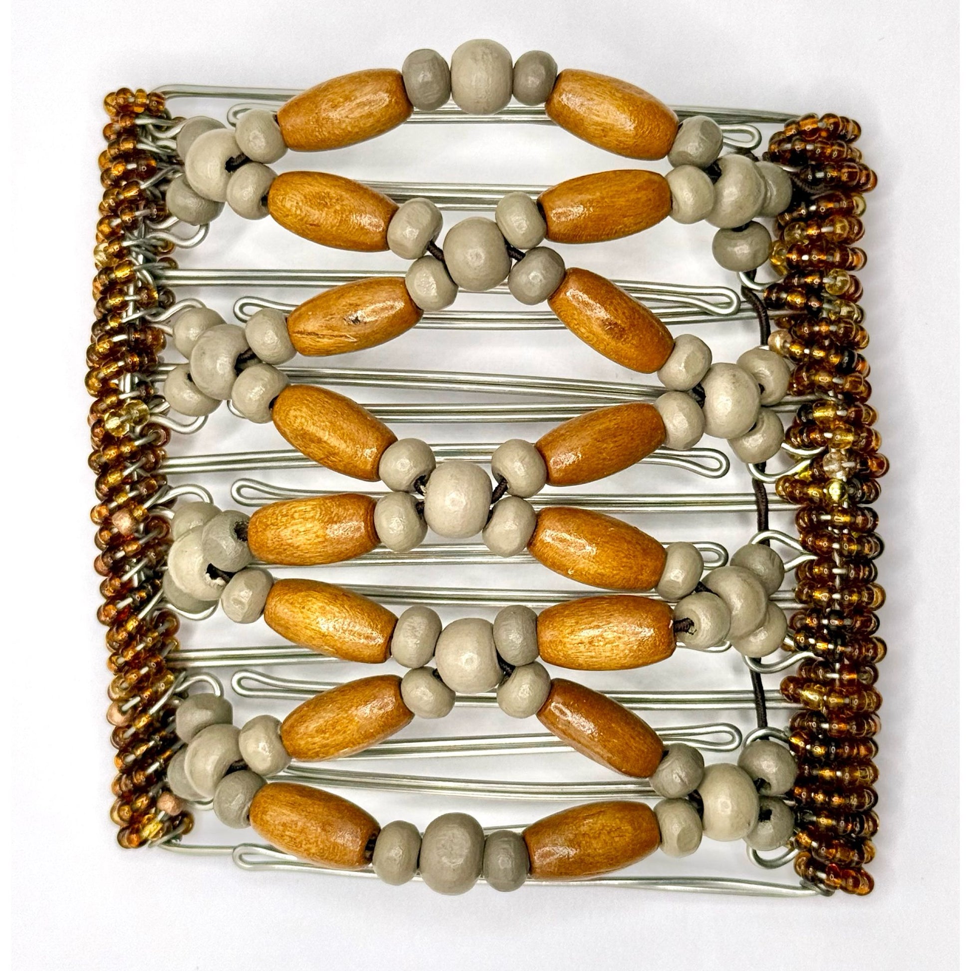 This attractive piece features a pattern of light brown and light gray wooden beads on a stainless-steel frame. The frame is wrapped in a neutral mix of brown Czech glass beads for grip and visual appeal.