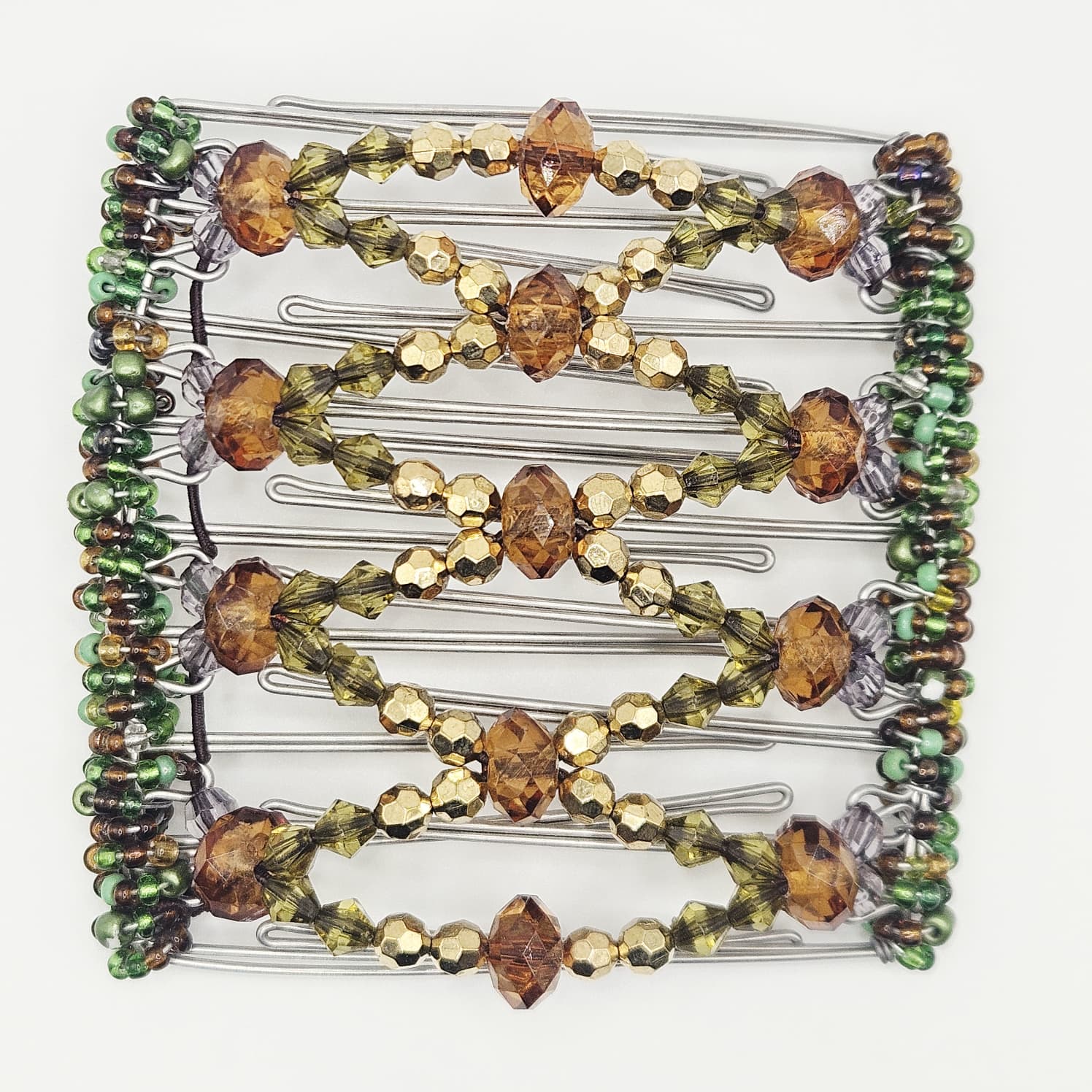 9 Tooth Large hair comb, Amber tone brioche side share and centre bead, olive green and gold tone geometric design patterns, Stainless steel frame with green and amber czech glass bead wrapping. Large size for thick and long hair