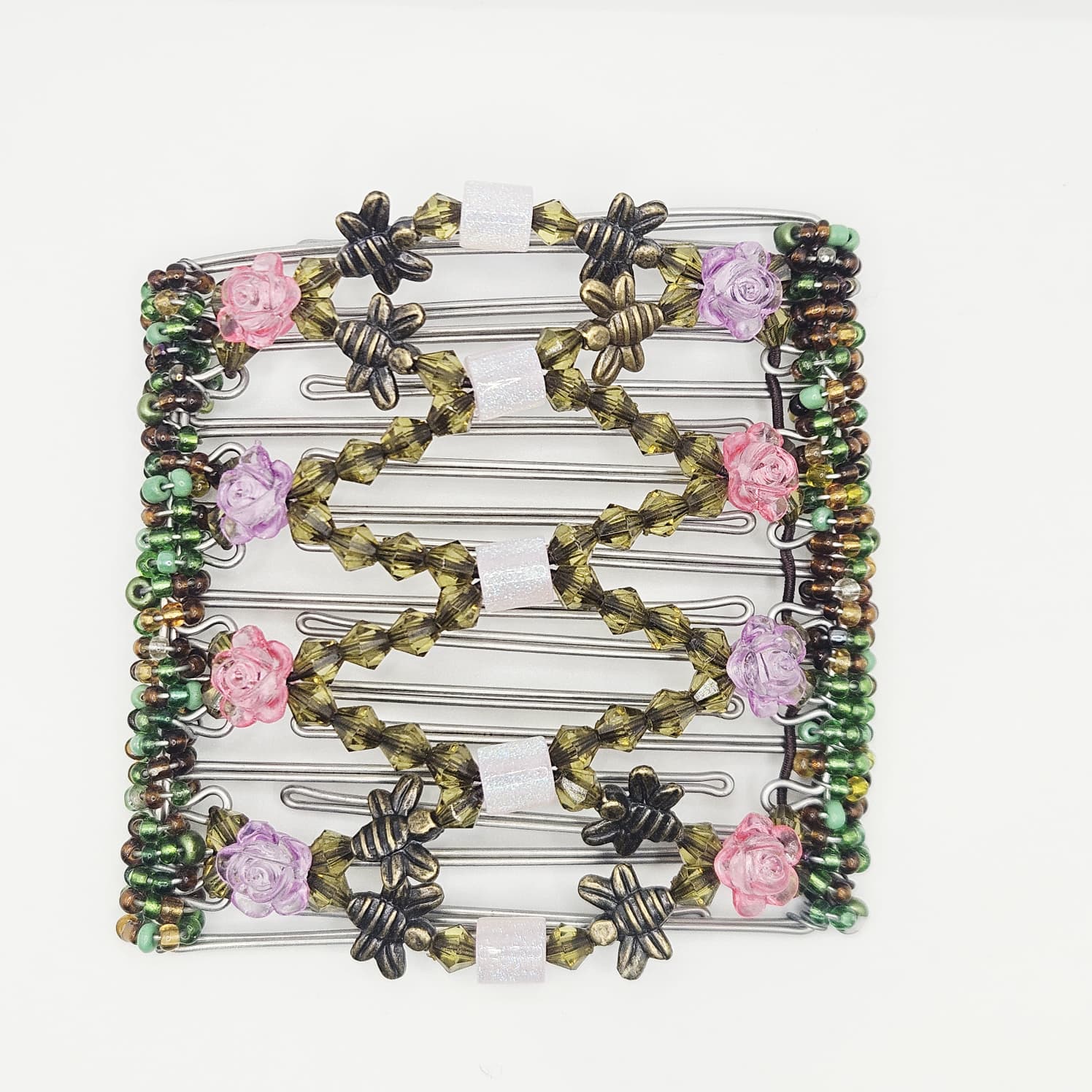 9 Tooth Large hair comb, Pink and Purple Floral design, Bronze Bee accents, Sparkle Pink Centre With Green accents , Stainless Steel frame with green and amber wrapping