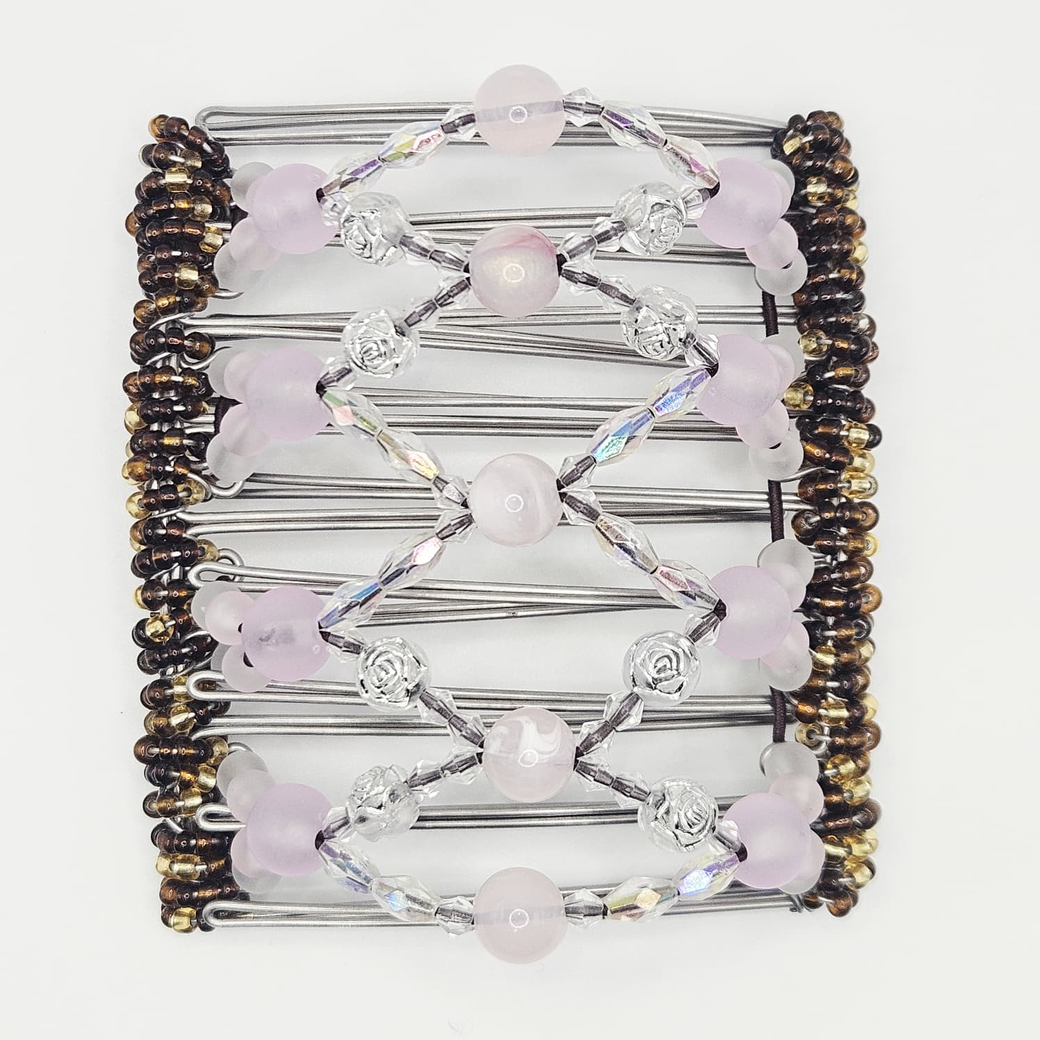 9 Tooth Large hair comb, Smokey pink resin centre beads with floral sparkle accents, frosted pink and clear resin bead design, Stainless steel frame with neutral brown czech glass bead wrapping, Large size for thick and long hair