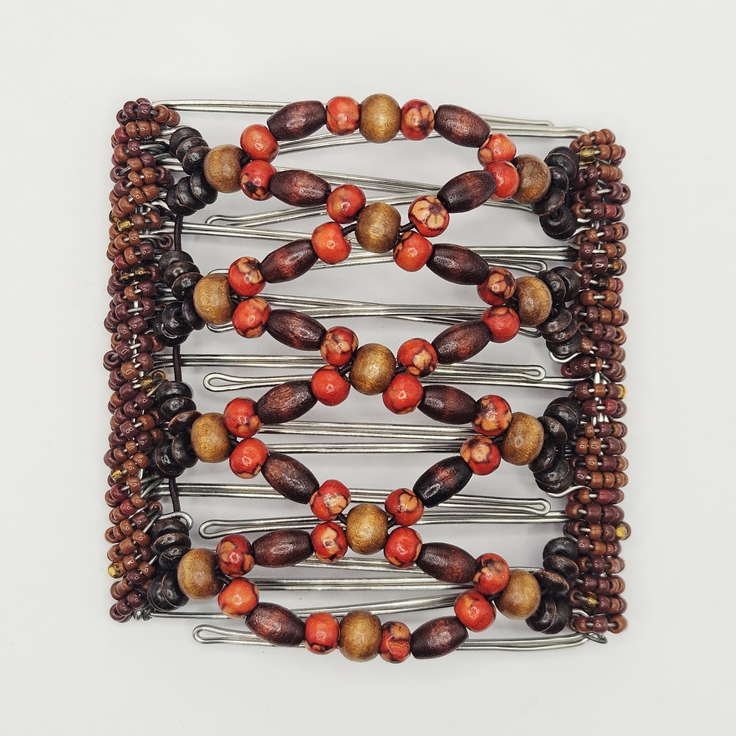 9 Tooth Large Hair comb,, Mixed brown wood beads with flower print red accents, Stainless steel frame with brown beaded wrapping